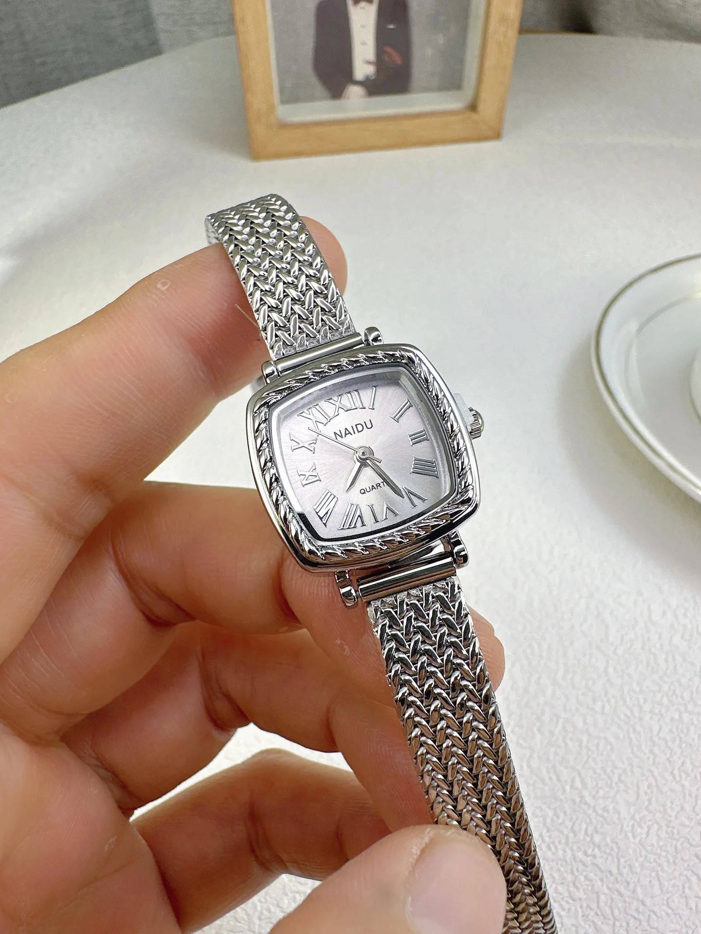 לוח השעון עם ספרות רומיות מעניק תחושת אלגנטיות ועל־זמניות, בעוד הצמיד מפלדת אל־חלד מוסיף מראה נקי ומעודן.