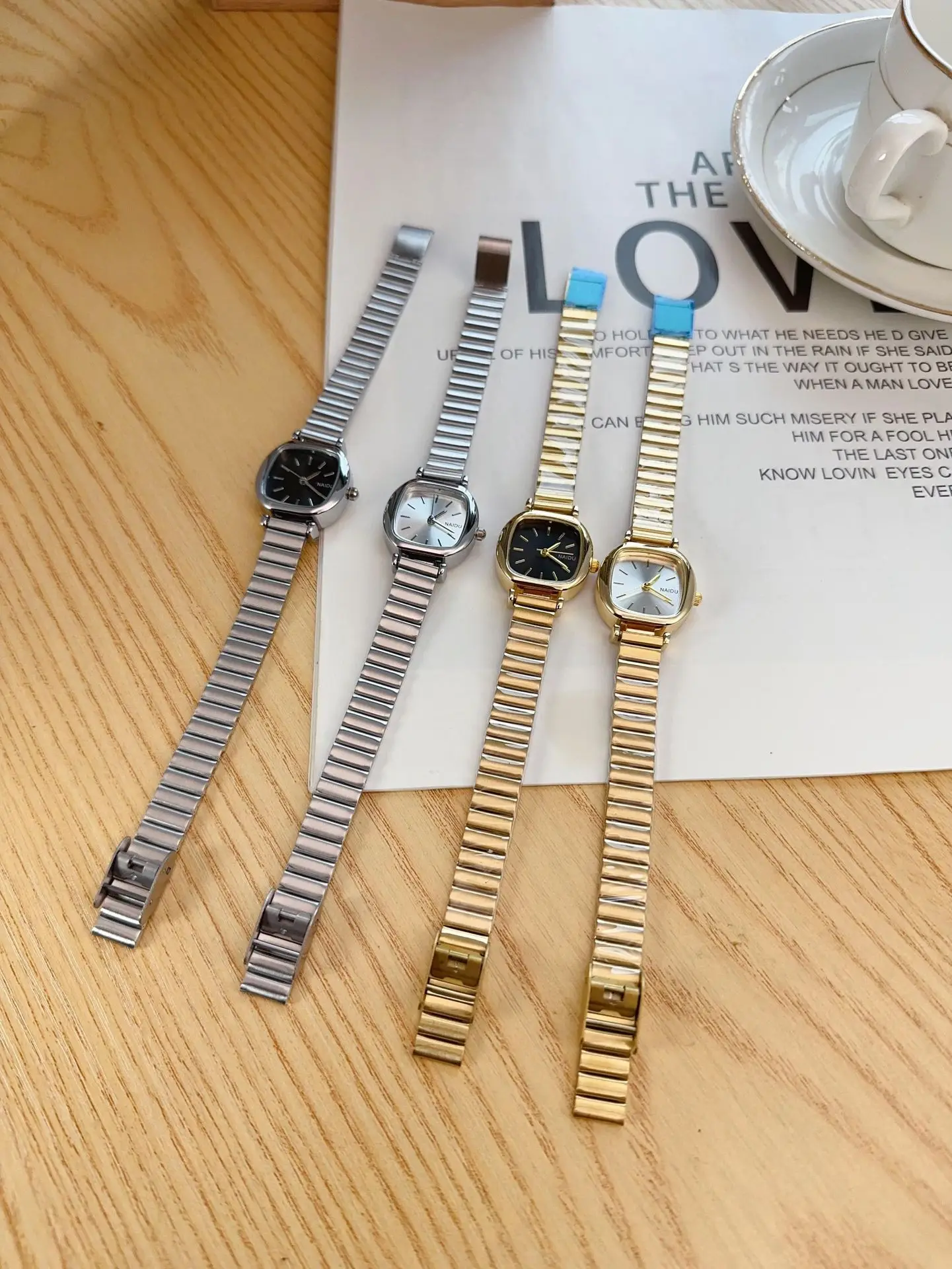לוח קטן וחלק ללא ספרות מדגיש אסתטיקה מדויקת וסטייל עכשווי, והצמיד מפלדת אל־חלד משלים את הקו האחיד והאלגנטי.